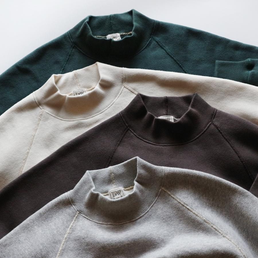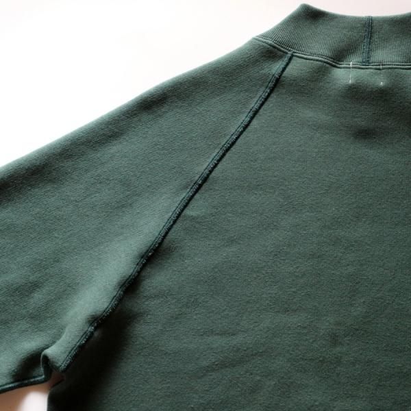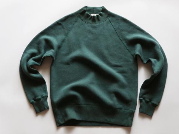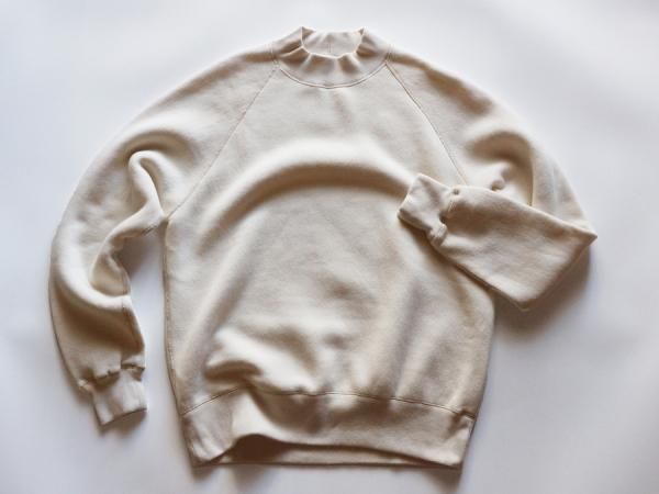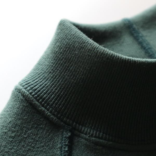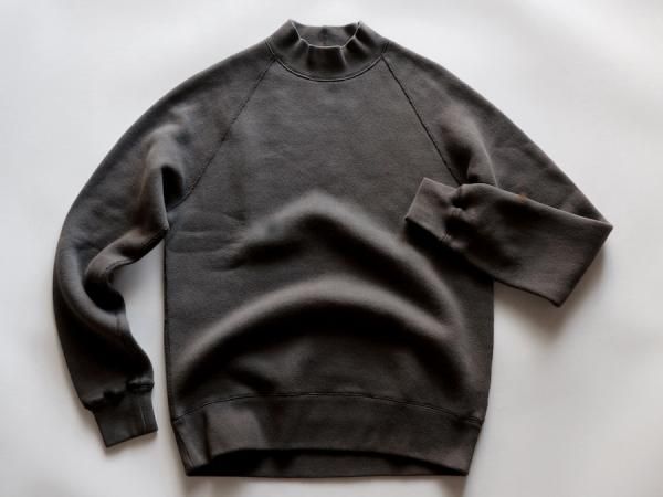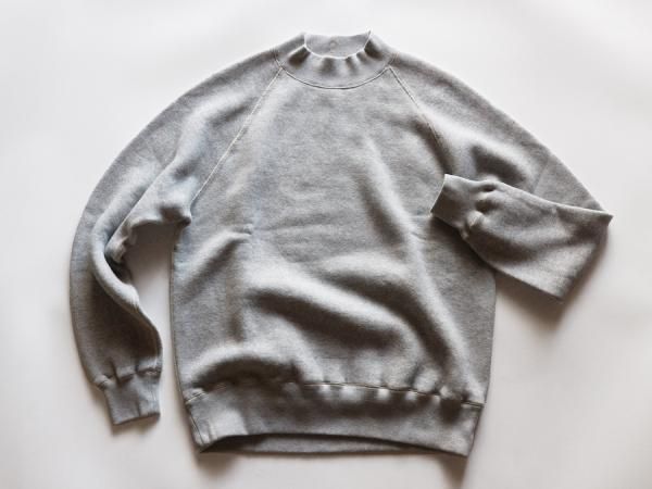 形は、60sのラグランスウェットシャツから着想を得た、保温性の高いミドルネックプルオーバー。肩、腕の可動域が広く、運動性、着心地、着脱に優れるクラシカルな直線ラグランスリーブ、熟練技術者が時間をかけ縫い上げる4本針フラットシーム縫製、暖かくヨレにくい厚手のリブ、古い年代のスウェット生地と同じ起毛加工で仕上げた保温性の高い羊毛状の特殊な裏起毛等、細かなディテールを手間をかけ再構築し、存在感のある4本針のステッチワークは、全体の雰囲気をさらに引き立てるデザイン。肩線のないラグランは、肩幅、肩形状を気にすることなく着用でき、身幅に程よいゆとりを持たせたシルエットは着やすさを高めながら、レイヤードにも対応できるバランスの良いレギュラーフィットに仕立てています。