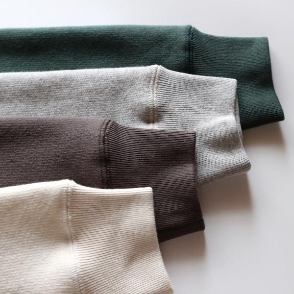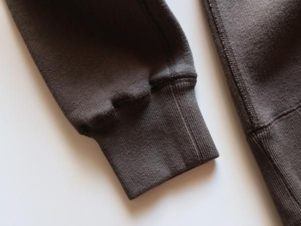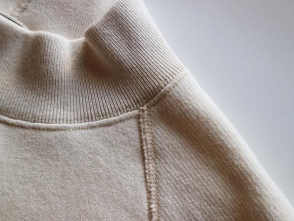 肩、腕の可動域が広く、運動性、着心地、着脱に優れた直線状のラグランスリーブ。熟練技術者が時間をかけ縫い上げる4本針フラットシーム縫製、ヨレにくく肌当たりの良い厚手のリブ仕様、クラシカルかつ保温性の高い特殊な裏起毛等、細かなディテールを手間をかけ再構築。