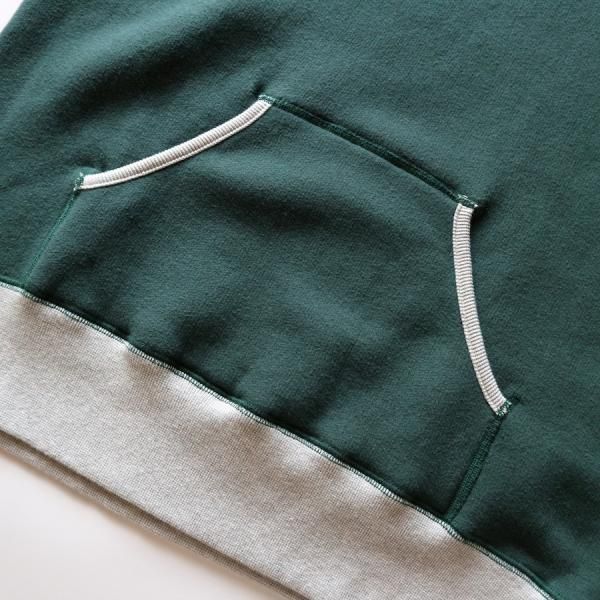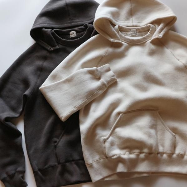 60sのラグラン後付けパーカーモチーフ。肩、腕の可動域が広く、運動性、着心地、着脱に優れた直線状のラグランスリーブ、後付けされたフード、耐久性のある特殊な3本針1本またぎバインダーネック、4本針で縫い付けられたポケット、熟練技術者が時間をかけ縫い上げる4本針フラットシーム縫製、ヨレにくい厚手のリブ仕様、クラシカルかつ保温性の高い特殊な裏起毛等、細かなディテールを手間をかけ再構築。表裏で糸配色を変えたステッチワークが全体の雰囲気をさらに引き立てるデザイン。