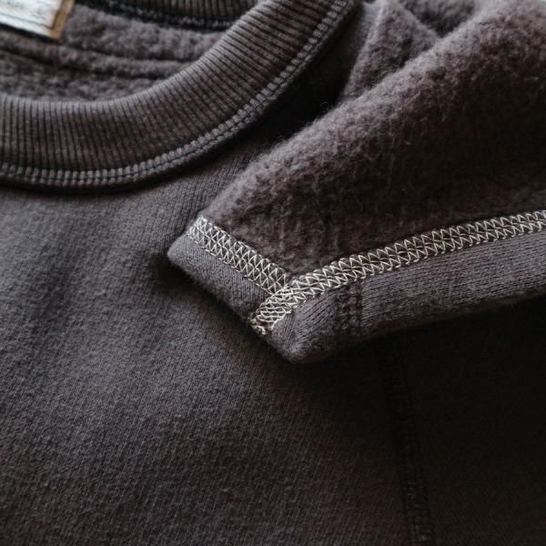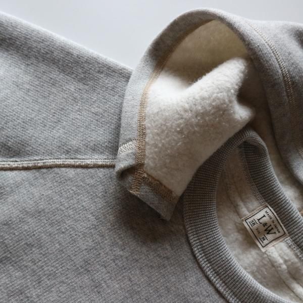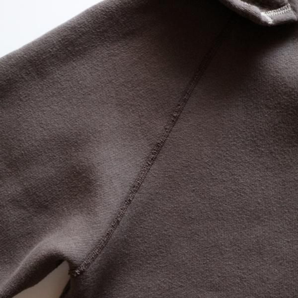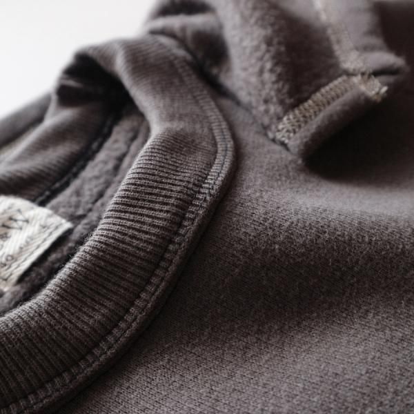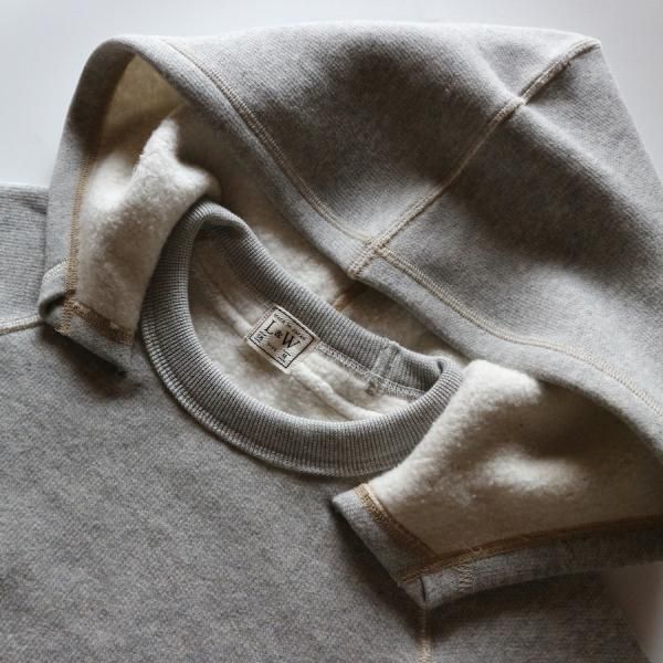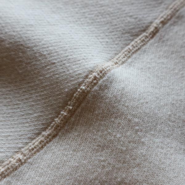 生地は、トンプキンスウェットのふっくらとした独特の素材感を受け継ぎながら、シンカー機の特徴である綺麗なループ目組織と、 ワンウォッシュ後、着用後に型崩れしにくい生地安定性を持ち、古い旧式編み機のデメリットでもある生地ヨレや洗い後の収縮率の不安定さを克服し、進化させたオリジナル起毛裏毛。ヴィンテージスウェットを彷彿とさせる風合いは、 経年着用で表情を増して行き、袖や首を通した瞬間に独自のふっくらとした暖かく着心地の良い素材感を体感できる特別な裏毛として作り上げています。