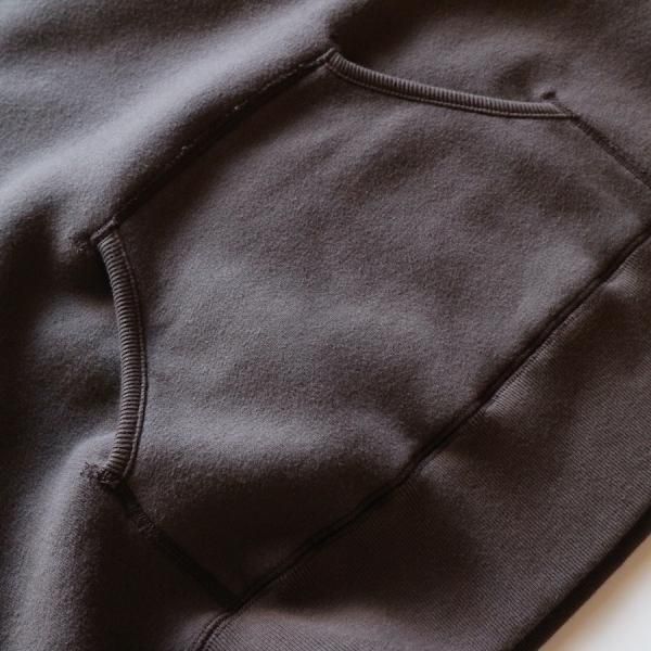 形は、60sのラグラン後付けパーカーモチーフ。肩、腕の可動域が広く、運動性、着心地、着脱に優れた直線状のラグランスリーブ、後付けされたフード、耐久性のある特殊な3本針1本またぎバインダーネック、4本針で縫い付けられたポケット、熟練技術者が時間をかけ縫い上げる4本針フラットシーム縫製、ヨレにくい厚手のリブ仕様、クラシカルかつ保温性の高い特殊な裏起毛等、細かなディテールを手間をかけ再構築。表裏で糸配色を変えたステッチワークが全体の雰囲気をさらに引き立てるデザイン。肩線のないラグランは、肩幅、肩形状を気にすることなく着用でき、身幅に程よいゆとりを持たせたシルエットは着やすさを高めながら、レイヤードにも対応できるバランスの良いレギュラーフィットに仕立てています。
