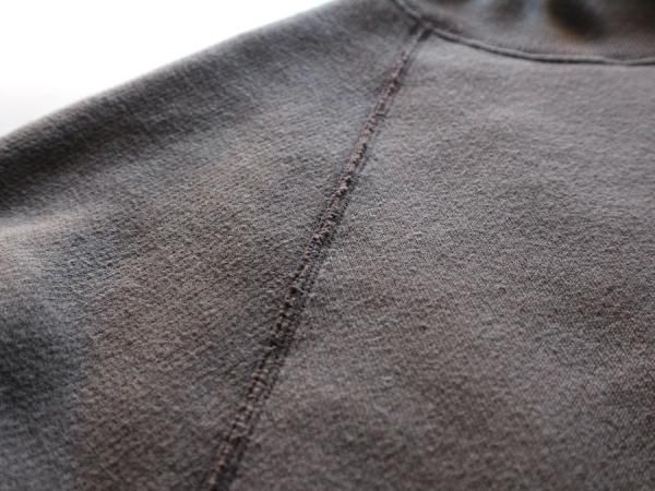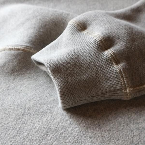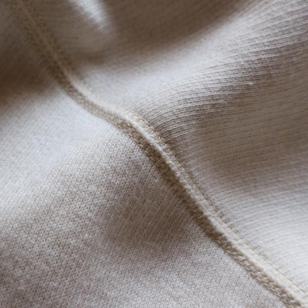 生地は、トンプキンスウェットのふっくらとした独特の素材感を受け継ぎながら、シンカー機の特徴である綺麗なループ目組織と、 ワンウォッシュ後、着用後に型崩れしにくい生地安定性を持ち、古い旧式編み機のデメリットでもある生地ヨレや洗い後の収縮率の不安定さを克服し、進化させたオリジナル起毛裏毛。ヴィンテージスウェットを彷彿とさせる風合いは、 経年着用で表情を増して行き、袖や首を通した瞬間に独自のふっくらとした暖かく着心地の良い素材感を体感できる特別な裏毛として作り上げています。